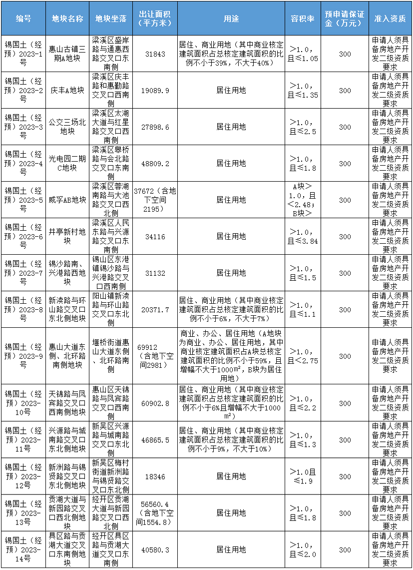 市场网首页 > 新闻中心 > 土地新闻 > 正文 14幅!无锡年内首批次预公告地块发布 2023-03-09 15:58:16 无锡市自然资源和规划局 2023年无锡市首批次预公告地块发布! 14幅地块覆盖五区 土地面积总计54.41万平米 其中 锡国土(经预)2023-3号地块(公交三场北地块) 锡国土(经预)2023-5号地块(威孚AB地块) 锡国土(经预)2023-6号地块(井亭新村地块) 为定销商品房 地块详情如下: (责任编辑:陈柯)