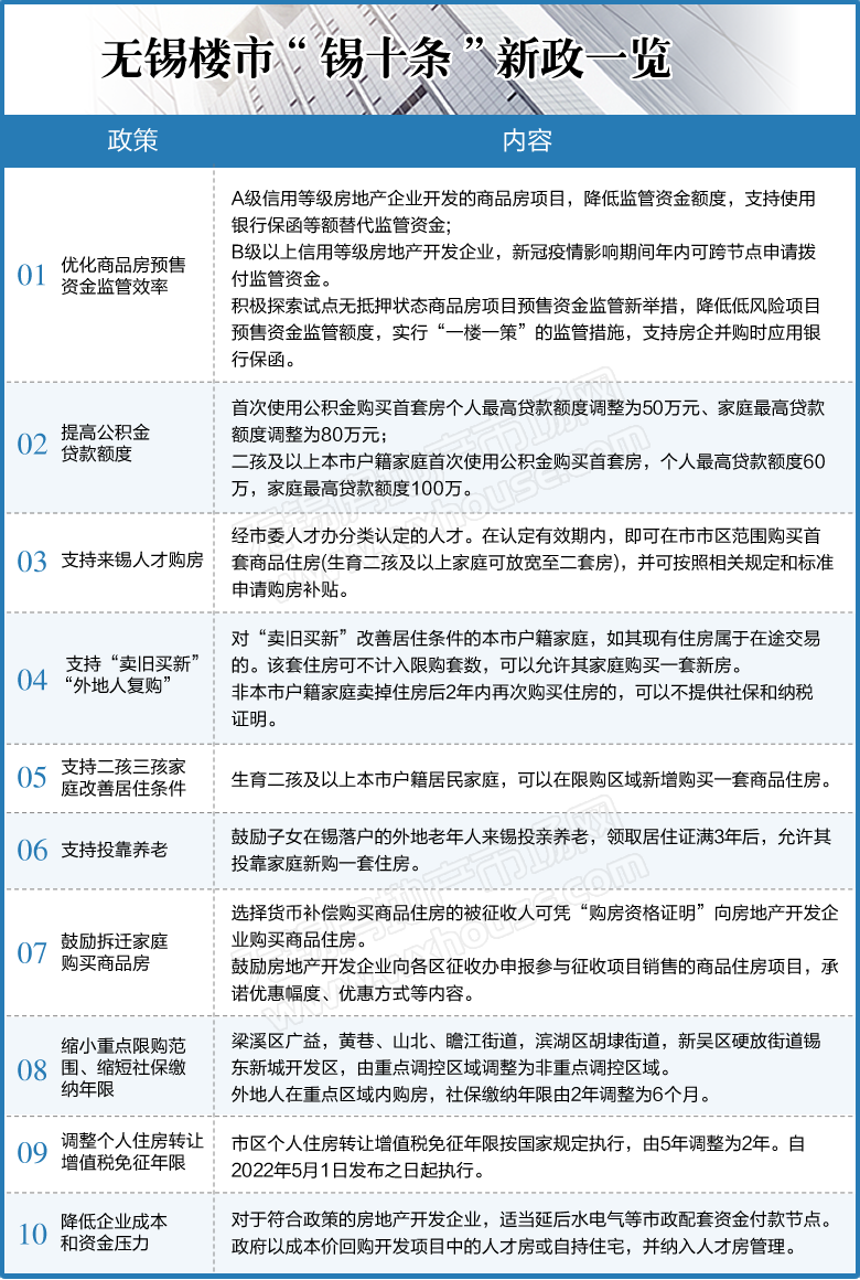 ”锡十条“从供给侧和需求端两个维度出发,推出十条利好政策,为房企减负、保障居民购房,覆盖房地产市场中的两大参与主体,为市场主体建立稳定发展的市场环境,提升市场主体向好预期。