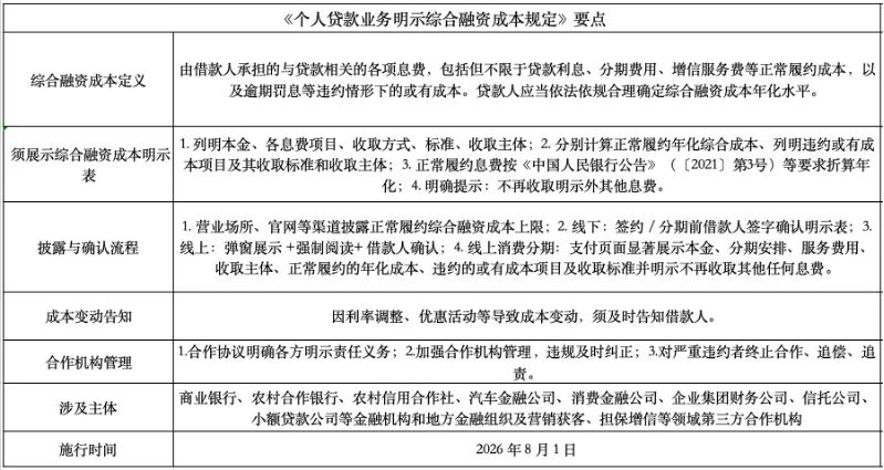 个贷新规指出,贷款人应当在营业场所、官网等渠道清晰披露借款人正常履约情形下的个人贷款综合融资成本上限。现场办理个人贷款业务的,应当在签署贷款合同或办理分期前,由借款人在综合融资成本明示表上签字确认。线上办理个人贷款业务的,应当通过弹窗方式向借款人展示综合融资成本明示表,设置强制阅读时间,由借款人在签署贷款合同或办理分期前确认。个贷新规自2026年8月1日起施行。