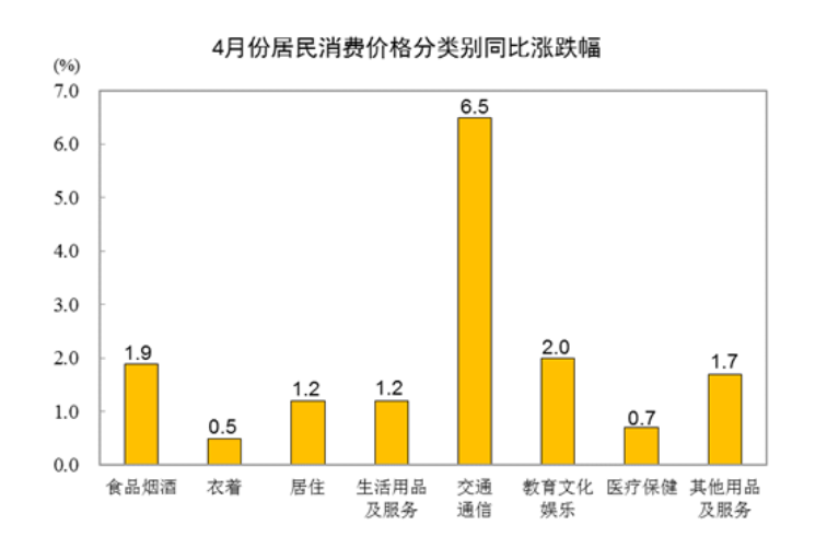 其他七大类价格同比均上涨。其中,交通通信、教育文化娱乐、其他用品及服务价格分别上涨6.5%、2.0%和1.7%,居住、生活用品及服务价格均上涨1.2%,医疗保健、衣着价格分别上涨0.7%和0.5%。