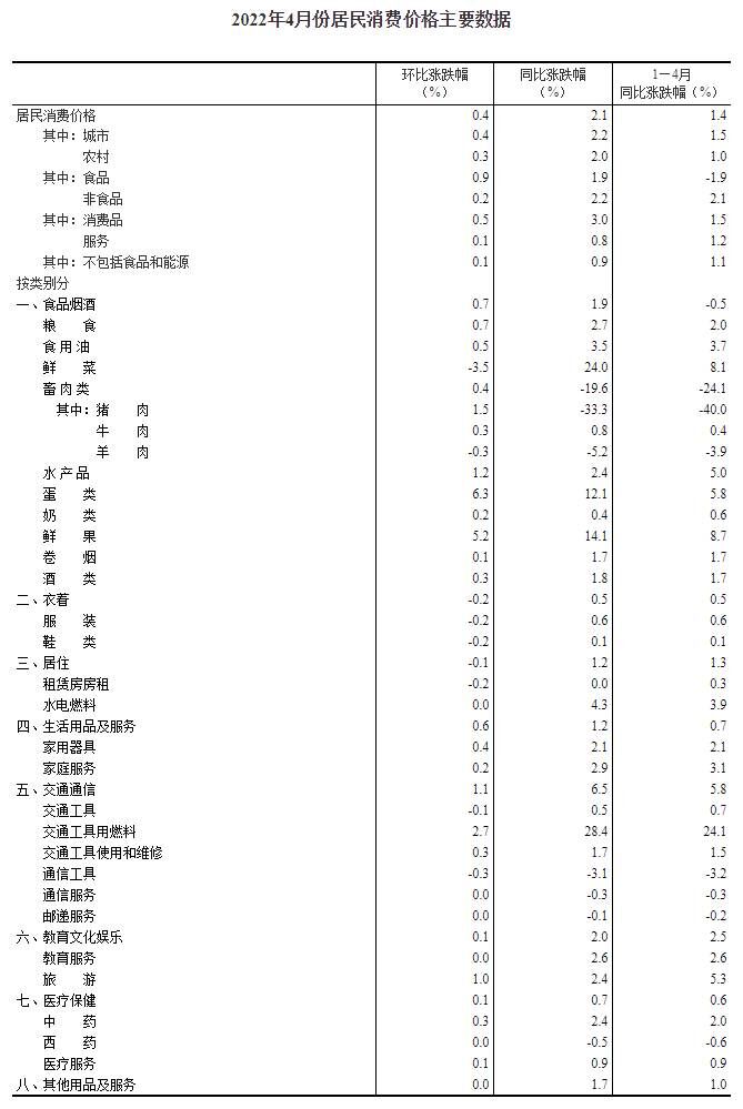 2022年4月份,全国居民消费价格同比上涨2.1%。其中,城市上涨2.2%,农村上涨2.0%;食品价格上涨1.9%,非食品价格上涨2.2%;消费品价格上涨3.0%,服务价格上涨0.8%。1??—4月平均,全国居民消费价格比上年同期上涨1.4%。