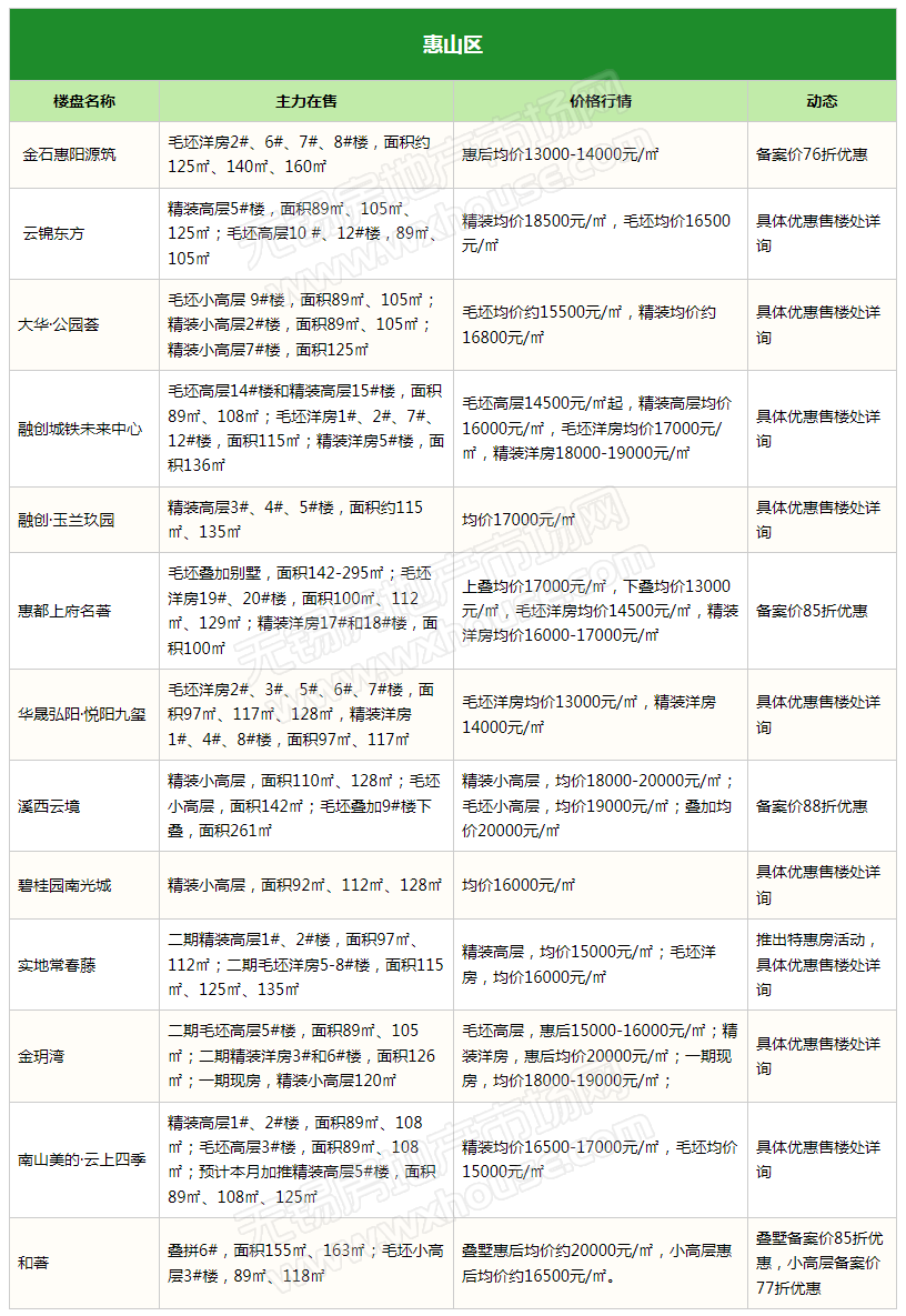 楼市步入5月,大市层面上来看依旧是信心依旧不足,打折促销正在回归,如金融街·广安控股·融府推出7.3折特价房;金融街·广安控股·融御推出7.5折特价房;万科漳湾国际推出的特价房7.2折起,融创山水江南推出约9.2折的特价房等。期待5月楼市能有更好的表现。(注:下表整理内容为锡城主流楼盘、主流物业,均为售楼处报价)