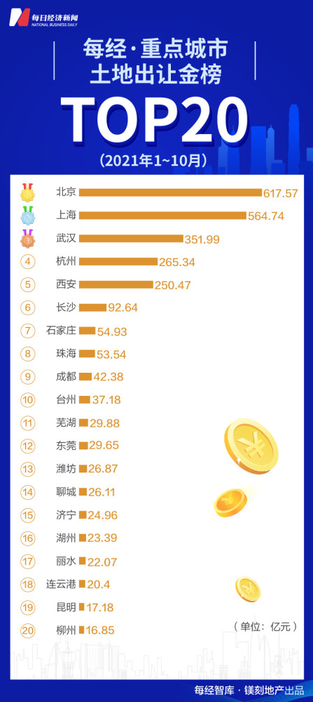 10月全国出让金排名前20城市成交总额为2568.14亿元,环比上个月(4041亿元)减少36%。