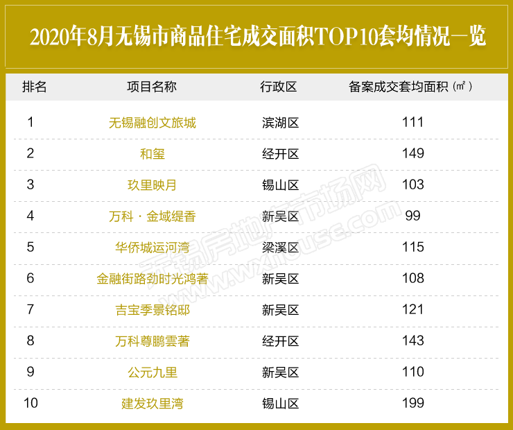 具体到个盘,以8月份商品住宅成交面积TOP10为例,套均面积100㎡以下的仅有万科·金域缇香,而其套均面积也达到了99㎡。