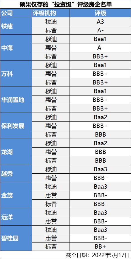 事实上,自2021年下半年以来,三大国际评级机构接连下调受评房企评级或展望已超过250余次,对房企融资等方面产生重大影响。在经历重重考验之后,能够维持投资级评级的房企屈指可数,仅有中海地产、华润置地、龙湖集团、中国金茂、远洋集团等十余家房企,代表着行业最后的“倔强”。