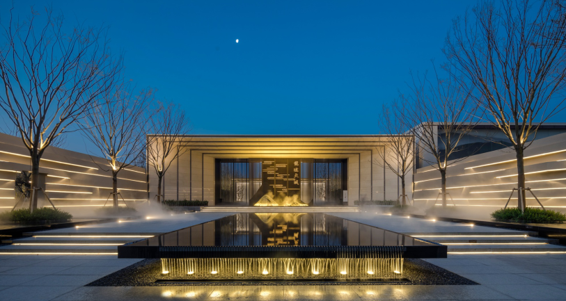 此次获得地产设计的龙运天城,在示范区设计上,取传统江南水院之意境,整体呈现“之”字形状,打造遇山--现云-上水-林动四重院落空间。环抱一面静水,水景在延展售楼处南立面的同时,结合景观,倒映柱廊山水。主体建筑与入口、围廊和院内水景共成山水合院。使用现代的设计手法将曲折回环院落布局在售楼处前达到高潮。