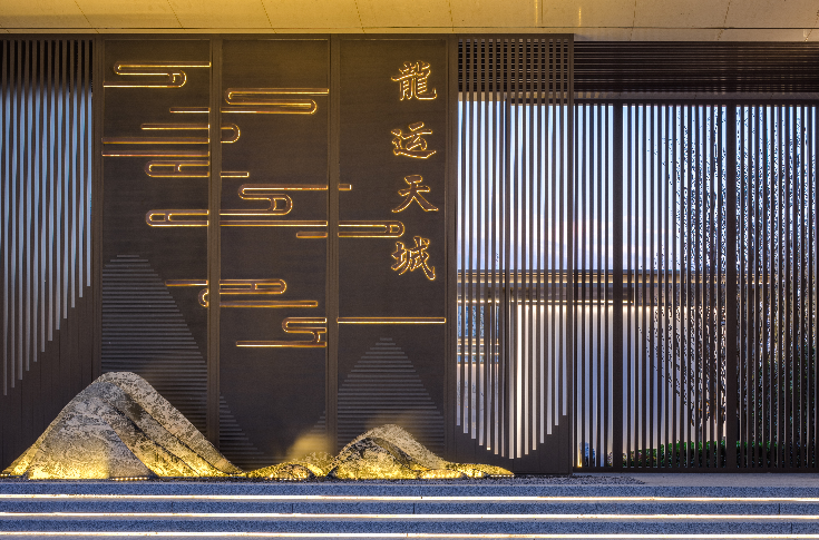 在前场空间以“遇山”为主题,提取山之形势,来营造项目第一界面;且入口空间界面采用“折线山墙”的手法进行打造,高4.8m的景墙由多条起伏折形元素构成,里面凹凸起伏之状,将自然山形之立体形态抽象化体现出来。