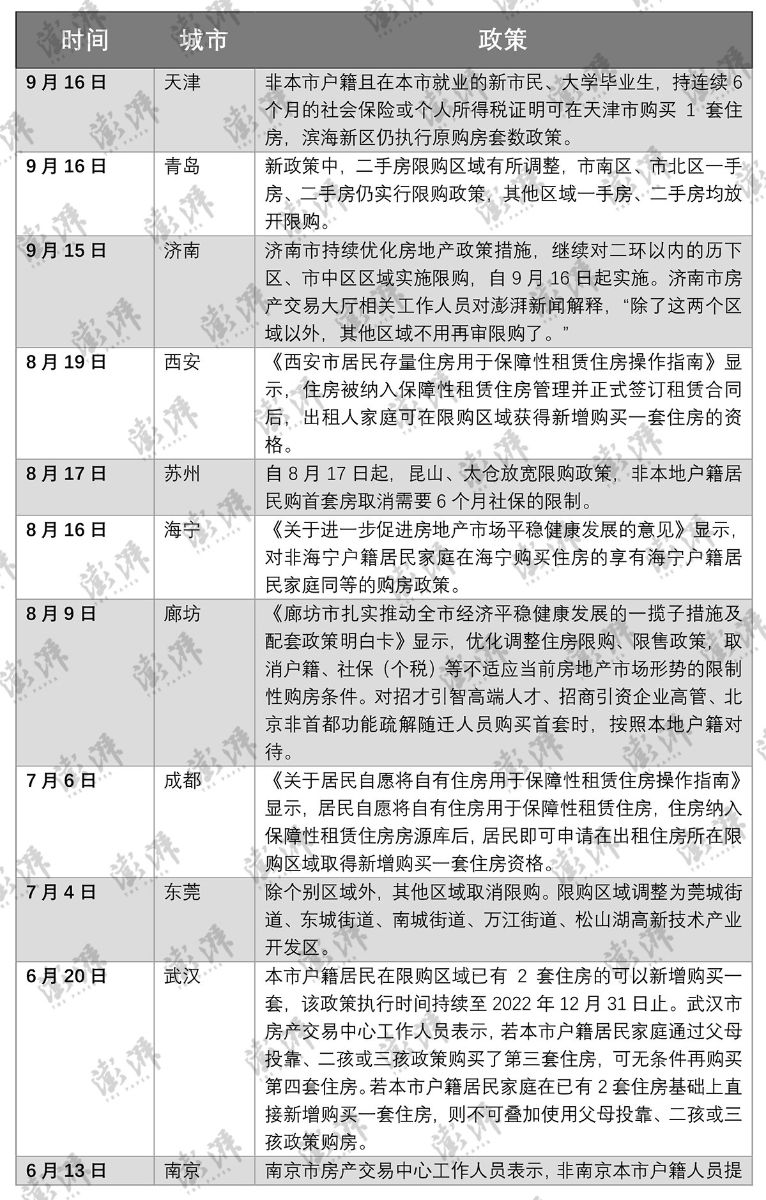 以天津为例,9月16日,据“天津住建”,天津市住房城乡建设委等7部门联合发布《关于进一步完善房地产调控政策促进房地产业健康发展的通知》(以下简称《通知》),《通知》提到,支持新市民合理购房需求,非本市户籍且在本市就业的新市民、大学毕业生,持连续6个月的社会保险或个人所得税证明可在天津市购买1套住房,滨海新区仍执行原购房套数政策。