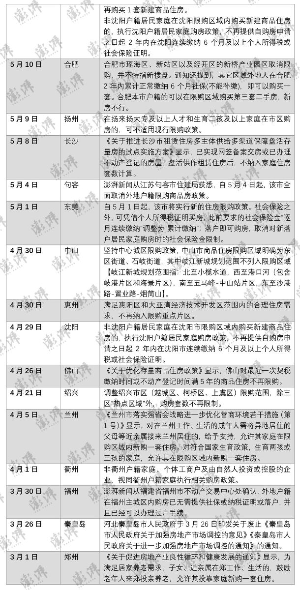 据澎湃新闻不完全统计,今年以来,包括郑州、秦皇岛、福州、衢州、兰州、绍兴、佛山、沈阳、惠州、中山、东莞、句容、长沙、扬州、合肥、沈阳、杭州、湖州、银川、大连、哈尔滨、唐山、无锡、江门、广州、九江、南京、武汉、成都、廊坊、海宁、苏州、西安、济南、青岛、天津等36个城市调整了楼市限购政策。