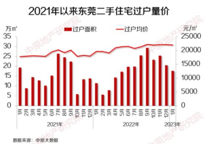中原地产研究院数据显示,2023年东莞1月一手住宅成交14万平(1185套),同比下降19%;二手住宅过户1668套,同比上升62%。