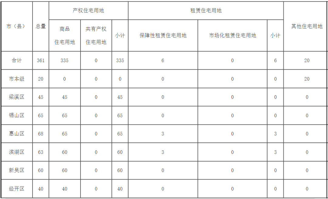 梁溪区土地供应272公顷,其中商品住宅用地45公顷,工矿仓储用地59公顷,公共管理与公共服务用地89公顷,交通运输用地34公顷;