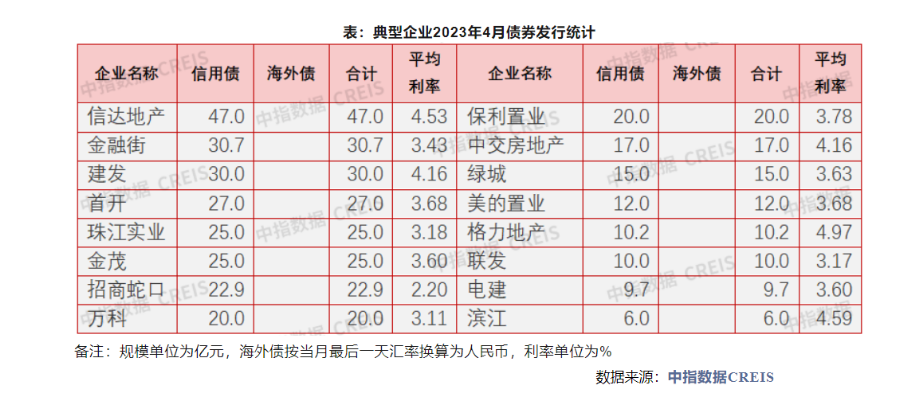 具体到企业表现来看,据中指研究院统计,4月信达地产融资额度最高,合计47.0亿元,平均融资利率4.53%;其次是金融街30.7亿元,平均融资利率4.16%。典型房企中格力地产的信用债利率较高,为4.97%;招商蛇口最低,为2.2%。