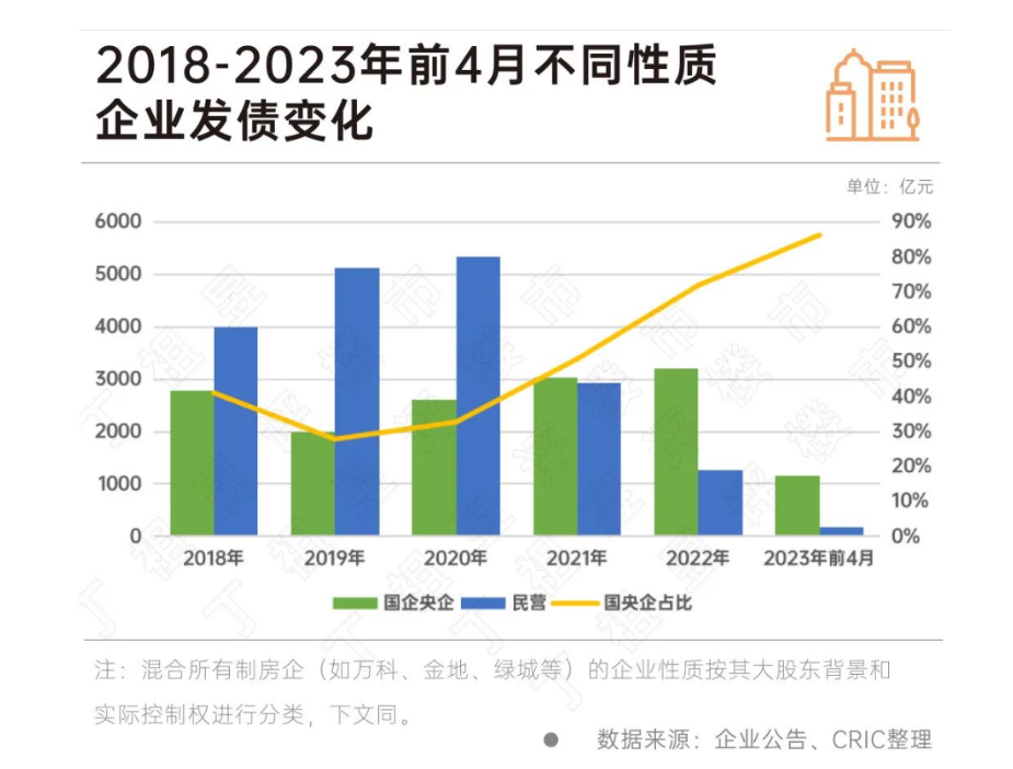 从成本上来看,克而瑞数据显示,国企央企今年前4月的融资成本为3.38%,民营企业达到6.34%,两者之间的差距达到2.96个百分点。“未来在行业集中度向头部集中下,房企无论是融资量还是融资成本预计将持续分化,更多的低息债将持续流向优质房企。”