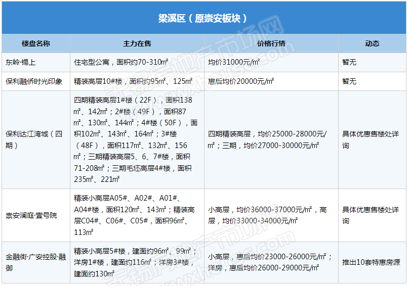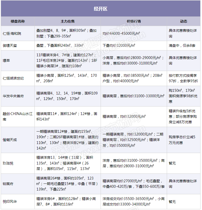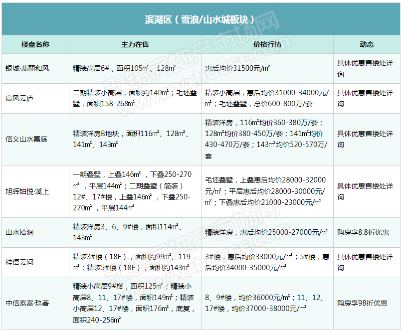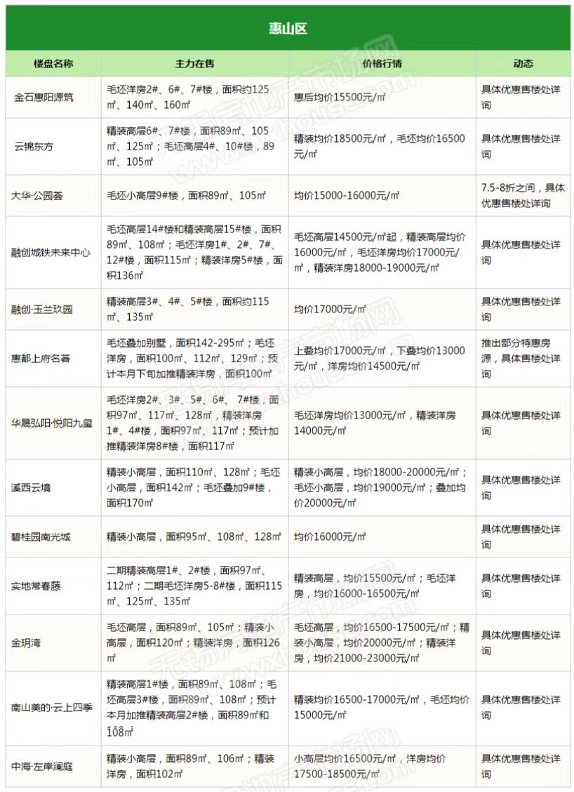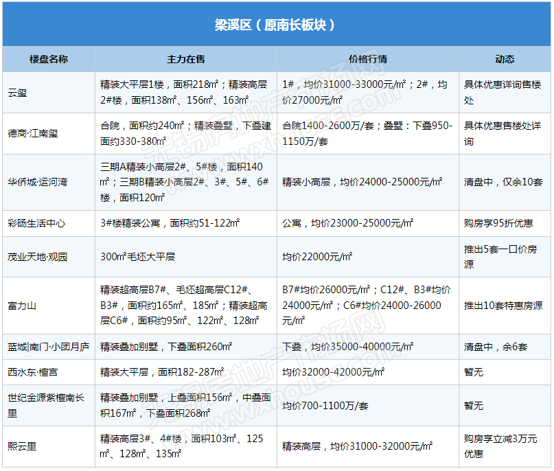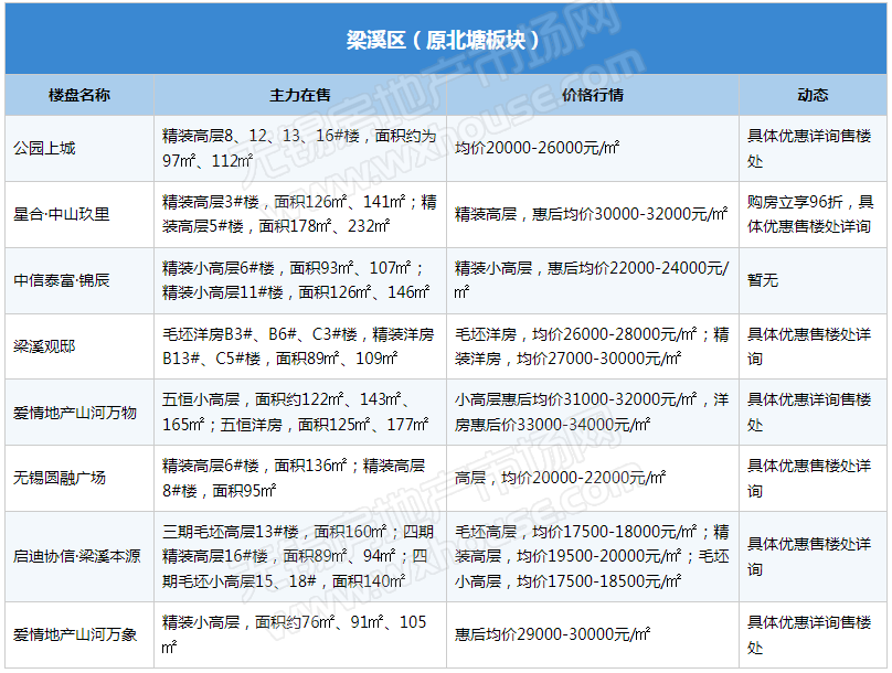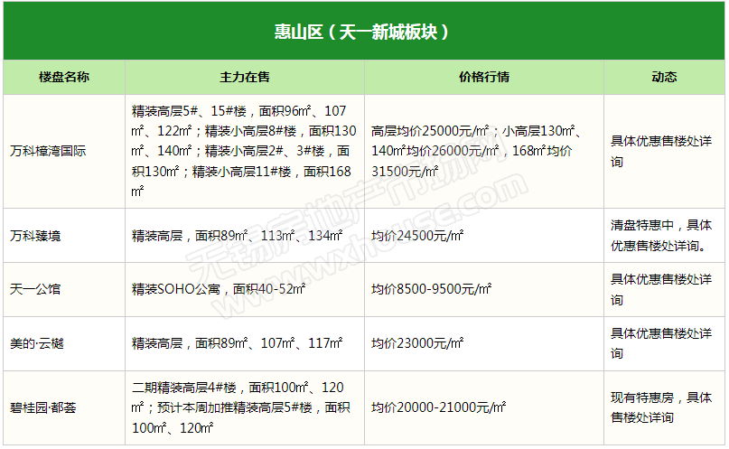 2023年开局,楼市积压存量需求逐步释放,锡城楼市“小阳春”行情逐渐显现,热门区域多楼盘表示到访量提升。随着楼市升温,部分楼盘表示将微调产品价格,信达督府天承、金领蠡洲台等产品报价均已上涨,但也有不少楼盘趁势推出特惠吸引购房客群,如融创·CHINA山水江南、山水拾涧、金融街·广安控股·融御等。(注:下表整理内容为锡城主流楼盘、主流物业,均为售楼处报价)