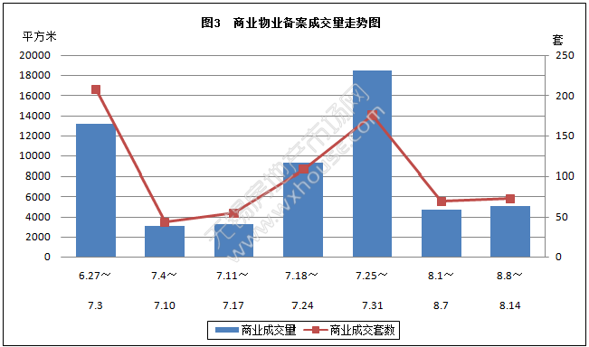 持续的高温天下,昼伏夜出成为无锡的生活常态,这让本就处于淡季的楼市来说更加受伤。本周全市商品房(不含经济适用房和定销商品房)备案成交量为5.83万平米,环比减幅26.29%;备案成交套数533套,环比减少161套,减幅23.20%。周度6万平米以内的成交量在今年以来仅出现过5次,而本周则是其一。在本周商品房备案成交中,愉樾天成以0.29万平米、22套的备案成交量位居住宅备案成交排行榜榜首。商业方面,五洲国际工业博览城以0.11万平米、20套的备案成交量位列榜首。东宝康园则位列办公排行榜榜首,备案成交面积0.15万平米、37套。