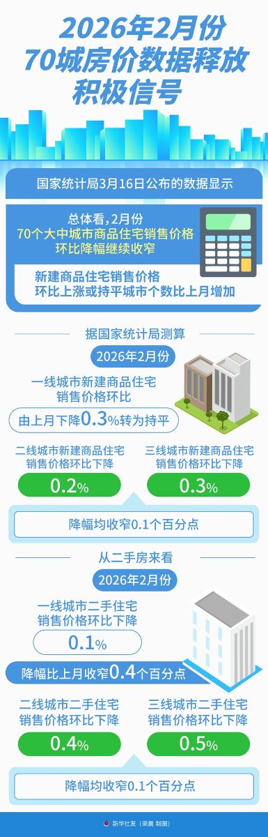 国家统计局16日公布的数据显示,总体看,2月份70个大中城市商品住宅销售价格环比降幅继续收窄;新建商品住宅销售价格环比上涨或持平城市个数比上月增加。专家表示,70个大中城市,尤其是作为风向标的一线城市房价环比呈现趋稳态势,释放出楼市进一步止跌回稳的积极信号。