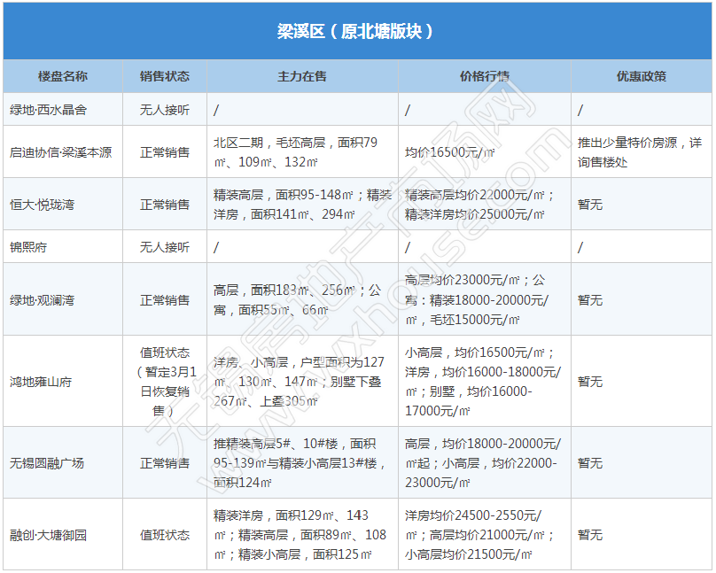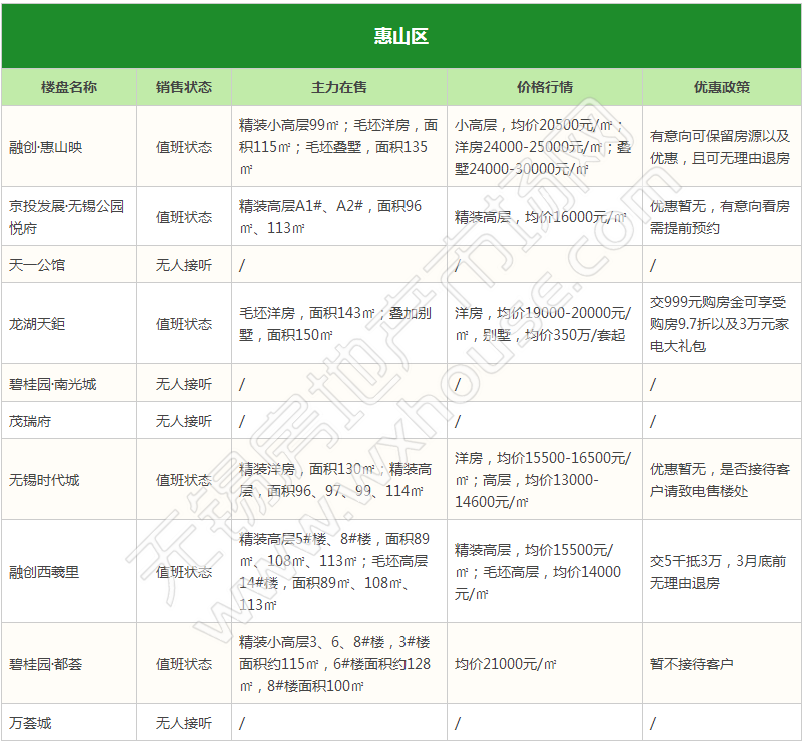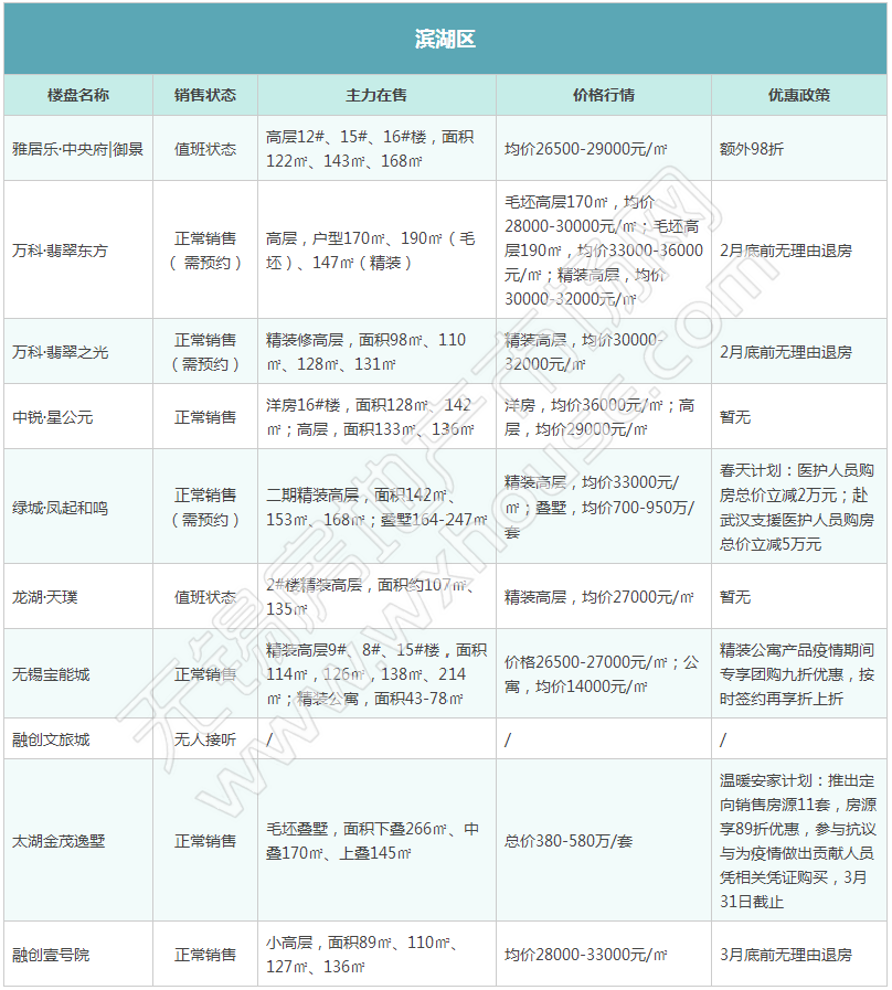 2月锡城主流在售项目及产品最新情报呈上。2020年春,受新冠肺炎疫情影响,房地产市场受到严峻考验,锡城各大售楼处暂时关闭,截止到目前,锡城仍有部分售楼处未正式复工,恢复正常销售的楼盘中不少楼盘推出购房优惠、无理由退房等营销活动,包括雅居乐、万科、绿城、宝能、融创、华润等等房企,小编致电锡城各大售楼处,为大家整理出最新复工情况及优惠政策。(注:下表整理内容为锡城主流楼盘、主流物业,均为售楼处报价)