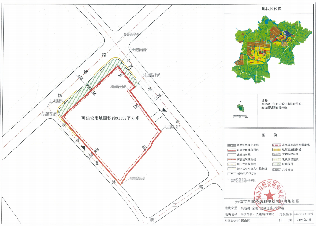 XDG-2023-16号地块,位于锡山区东港镇锡沙路与兴港路交叉口西南侧,总可建设用地面积31132㎡,居住用地,容积率>1.0,且≤1.5,土地出让金出让起始总价28720万元,起始楼面价6150元/㎡,最高限价33028万元。