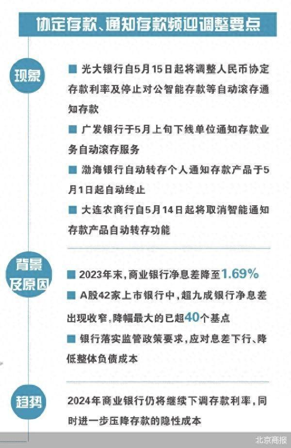 继定期存款利率下行、大额存单额度收缩后,银行协定存款、通知存款也频频迎来调整。近日,光大银行发布公告宣布,自5月15日起,将调整人民币协定存款利率以及停止对公智能存款等自动滚存通知存款。在此之前,已有多家银行取消了个人或单位通知存款的自动转存功能。在分析人士看来,在息差下行压力之下,下调存款利率、压降负债成本成为商业银行的共同选择,但不同的银行由于市场竞争压力、客户定位、负债结构等因素有所不同,调整存款利率的节奏、幅度也各有不同,预计2024年商业银行仍将继续下调存款利率,同时将进一步压降存款的隐性成本。