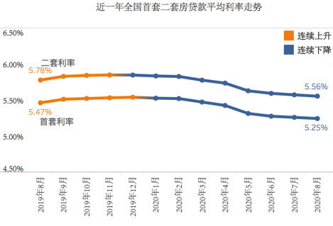 根据融360大数据研究院对全国41个重点城市674家银行分支机构房贷利率的监测数据显示,2020年8月(数据监测期为2020年7月20日-2020年8月18日),全国首套房贷款平均利率为5.25%,环比下调1BP(1BP即1个基点,相当于0.01个百分点);二套房贷款平均利率为5.56%,环比下降2BP。