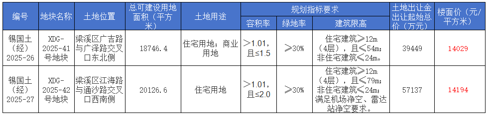 XDG-2025-41号地块(莫家庄地块):该地块位于梁溪区广吉路与广泽路交叉口东北侧,占地面积18746.4㎡,容积率1.5,为居住、商业用地,起拍总价39449万元,起拍楼面价14029元/㎡。地块周边交通优势突出,十分钟生活圈内有多个商业体,家居产业人口众多。