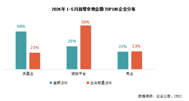 记者注意到,今年前5月,仍有近七成销售百强房企尚未拿地。同时,地方城投平台成为土地市场中不可忽视的重要力量,前5月投资金额百强房企中有56家为城投平台公司,央国企和民营房企分别为21家和23家。投资金额百强房企中,央国企和城投平台的拿地金额占比分别为48%和29%,民营房企占比为22%。