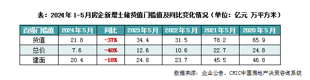 来自克而瑞的报告显示,截至今年5月末,房企新增土储货值百强门槛值为21.8亿元,同比下降37%,新增总价、建筑面积百强房企门槛值分别为7.6亿元和20.4万平方米,同比降幅分别为40%和18%。其中,拿地金额超200亿元的仅中建壹品、建发房产、华润置地和滨江集团。