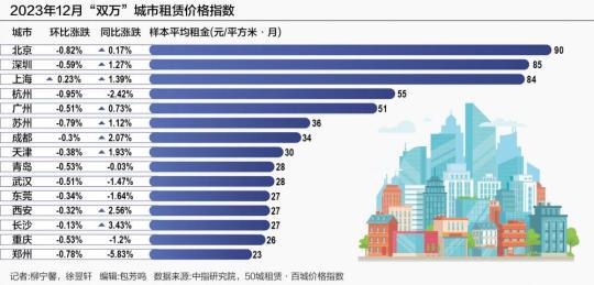根据中指研究院公布的租赁数据,在“双万”城市中,杭州2023年12月的样本平均租金仅次于北京、深圳、上海,排在第四,为55元每平方米每月。