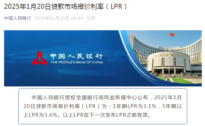 市场网首页 > 新闻中心 > 各地新闻 > 正文 1月LPR报价出炉:1年期和5年期以上利率均维持不变 2025-01-20 09:37:52 中国人民银行 中国人民银行授权全国银行间同业拆借中心公布,2025年1月20日贷款市场报价利率(LPR)为:1年期LPR为3.1%,5年期以上LPR为3.6%。以上LPR在下一次发布LPR之前有效。 (责任编辑:张一男)
