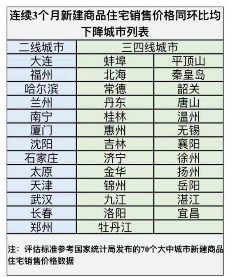 而进入2023年之后,按照最新的评估标准,城市数量再度扩容。根据国家统计局发布的数据,近期,新建商品住宅销售价格同环比均连续3个月下降的城市共有38个。其中,二线城市有13个,包括大连、福州、哈尔滨、厦门、石家庄、天津、郑州等。三四线城市则有25个,包括北海、惠州、唐山、温州等。这意味着,全国70个大中城市中,超过一半的城市可以调整首套房贷款利率下限。