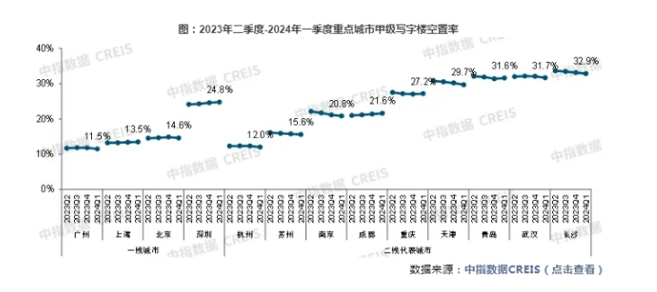 空置率方面,根据中指数据,2024年一季度,一线城市甲级写字楼空置率相对较低,其中广州最低,为11.5%;二线代表城市中,杭州、苏州甲级写字楼空置率分别为12.0%、15.6%,市场供求相对平衡,青岛、武汉、长沙等城市甲级写字楼空置率相对较高,空置压力相对较大。