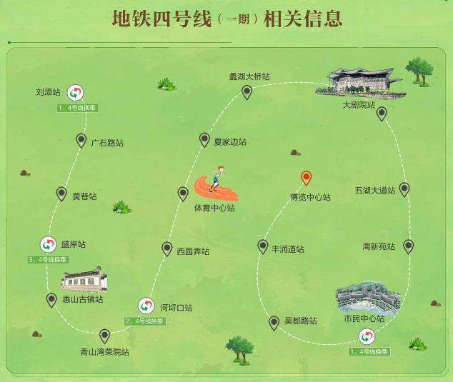 目前公布的地铁4号线一期18个站点名为:刘潭、广石路、黄巷、盛岸、惠山古镇、青山湾荣院、河埒口、西园弄、体育中心、夏家边、蠡湖大桥、大剧院、五湖大道、周新苑、市民中心、吴都路、丰润道、博览中心。