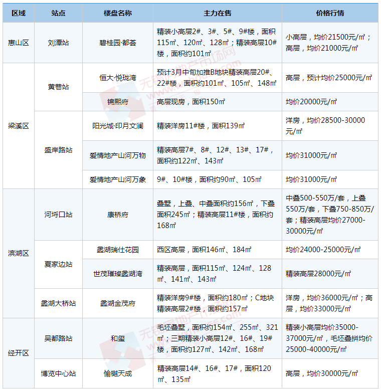 据小编粗略统计,目前地铁4号线一期沿线在售楼盘有12个,其中惠山区有1个,梁溪区有5个,滨湖区有4个,经开区有2个。沿线新盘偏改善,均价基本超2.5万+元/㎡。