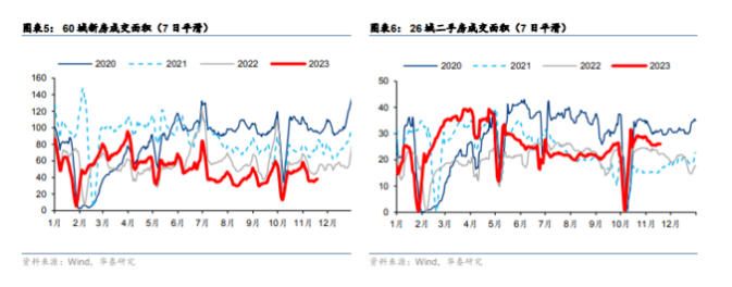 报告数据显示,市场企稳仍需一段时间。23年11月1-17日,60城新房累计成交面积同比-22%,环比+14%;26城二手房累计成交面积同比+10%,环比+45%;23年1 月1日-11月17日,60城新房累 计成交面积同比-12%;26城二手房累计成交面积同比+25%。贝壳领先指标方面,二手房KMI指数31.7(11月 17日),为2020年来14%分位。