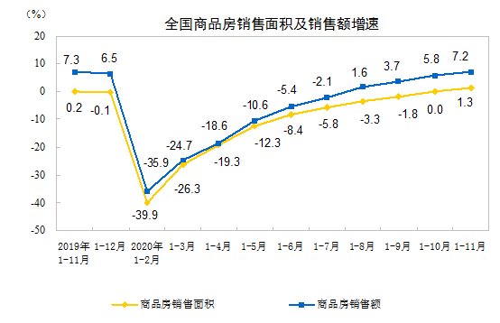商品房销售和待售情况方面,1-11月份,商品房销售面积150834万平方米,同比增长1.3%,增速比1-10月份提高1.3个百分点。