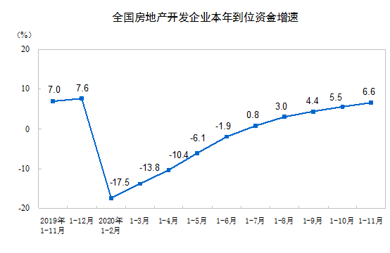 房地产开发企业到位资金情况方面,1-11月份,房地产开发企业到位资金171099亿元,同比增长6.6%,增速比1-10月份提高1.1个百分点。