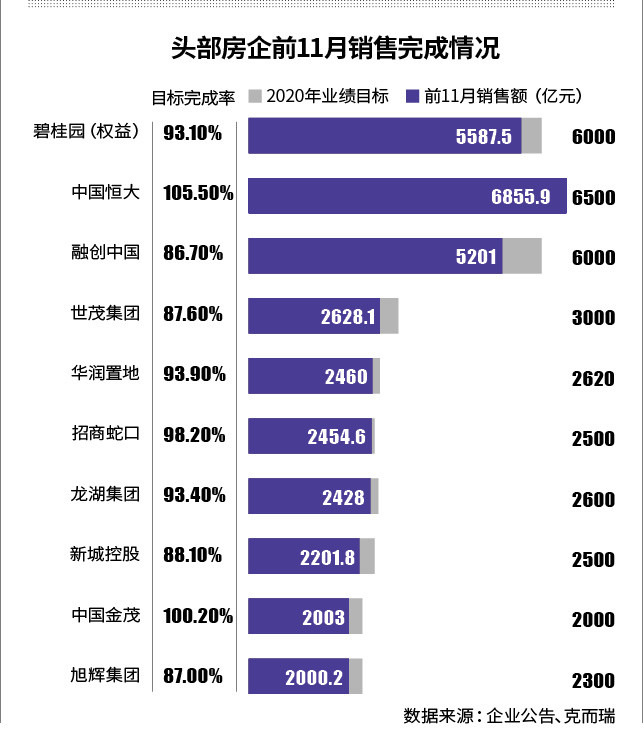 截至2019年11月末,近七成房企的目标完成率已达到90%以上,9家房企已提前达成了全年目标。超二成房企目标完成率在80%―90%之间。