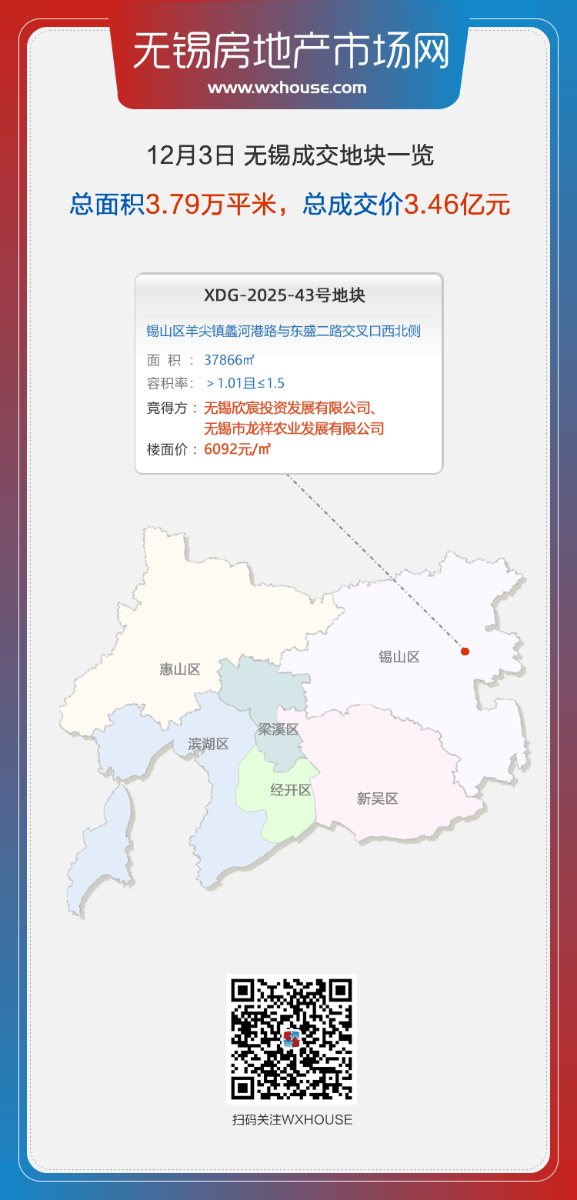 12月3日,锡山区宛山湖花苑南地块成交,总成交3.5亿元,成交楼面价6092元/㎡,由无锡欣宸投资发展有限公司和无锡市龙祥农业发展有限公司联合拿下。