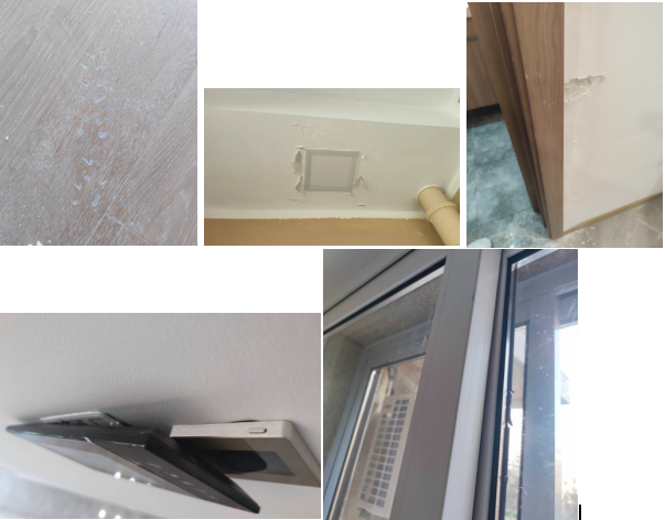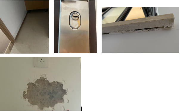 入户门锁松动、地面空鼓、墙体开裂、墙面众多划痕、卫生间餐厅墙面湿痕、卫生间木门变形无法关闭、窗户下方打胶开裂无法关闭、室内使用廉价乳胶漆……