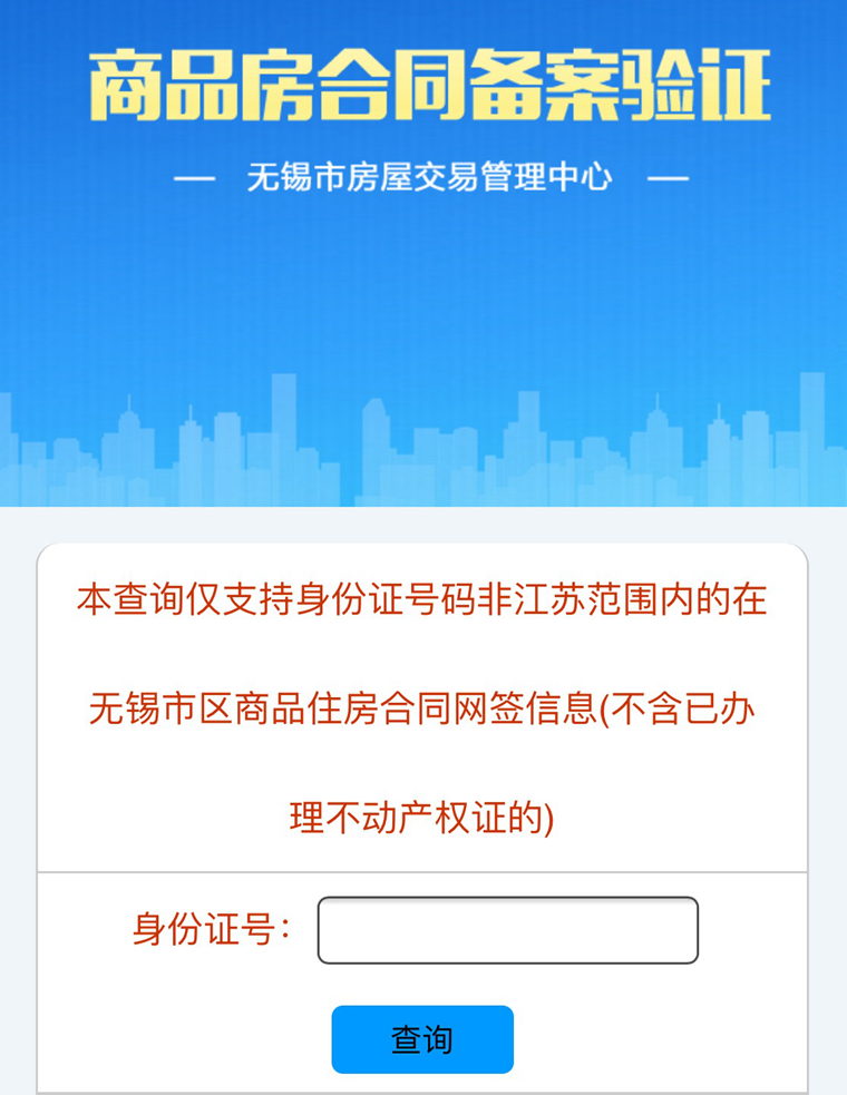 为落实无锡市疫情防控应急指挥部办公室印发的《关于入锡通道进一步优化查控流程提高通行效率的通知》要求,加快各入锡通道非江苏身份证号人员个人住房信息查询(已购商品住房并完成合同网签但尚未办理不动产权证),保障通行效率,无锡市住建局下属房屋交易管理中心部署开通了微信扫码查询渠道,您只需打开手机微信“扫一扫”,扫描相应二维码后输入您的身份证号,立即可以显示您在锡的商品住房合同网签信息(不含已办理不动产权证的)。