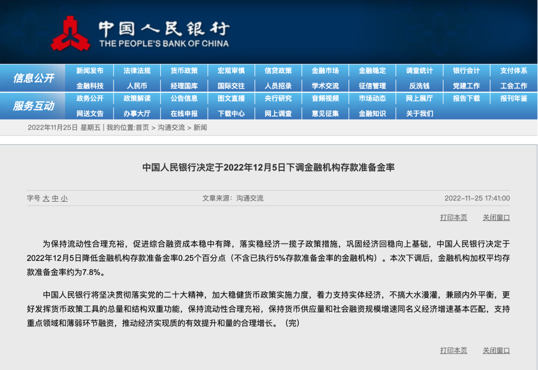 为保持流动性合理充裕,促进综合融资成本稳中有降,落实稳经济一揽子政策措施,巩固经济回稳向上基础,中国人民银行决定于2022年12月5日降低金融机构存款准备金率0.25个百分点(不含已执行5%存款准备金率的金融机构)。本次下调后,金融机构加权平均存款准备金率约为7.8%。