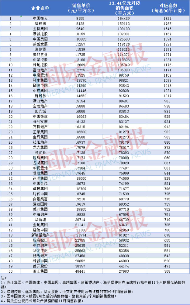 其中,中国恒大、碧桂园、金科集团、中国奥园、荣盛发展、中梁控股、绿地控股在内的11家房企需卖出超10万平的面积才能达到13.41亿元。