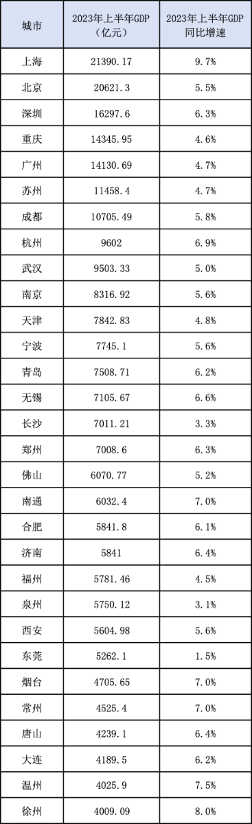 具体看经济总量,30强城市上半年GDP均在4000亿元以上,7座城市半年GDP超过万亿元,上海、北京突破2万亿元。