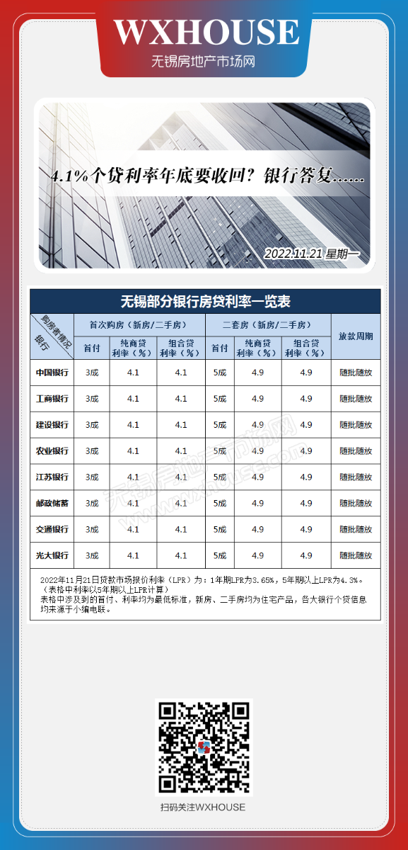小编致电无锡多家主流银行,了解到目前无锡个贷利率仍保持不变:首套房利率最低按照4.1%执行,二套最低按照4.9%执行,包括组合贷。