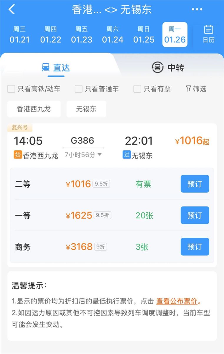 据了解,票价实施动态折扣。目前,无锡前往香港的去程高铁时间尚未上线,预计将于明日上线。