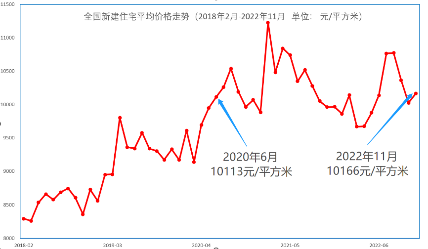 经历2年零5个月的波动,全国新房价格每平方米只变化了53元。全国新房价格从2020年6月攀上10113元/平方米的万元整数关口后,历经两年多,一直在万元左右震荡。从那时到现在,新房价格经历了3轮上涨和3轮下降。3轮上涨分别是2020年6月至8月、2020年12月到2021年2月、今年4月到7月。3轮下降分别是2020年8月到2020年12月、2021年2月到今年4月、今年8月到11月。这期间,新房价格最高曾达11228元/平方米,较低时曾探至9671元/平方米。今年11月与2020年6月,时间相差2年零5个月,新房价格每平方米相差53元。