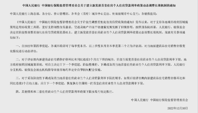 今年1月5日央行和银保监会联合下发的首套住房贷款利率政策动态调整机制第三条规定,此前阶段性放宽房贷利率下限的城市,“如果后续评估期内新建商品住宅销售价格环比和同比连续3个月均上涨,应自下一个季度起,恢复执行全国统一的首套住房商业性个人住房贷款利率下限。”