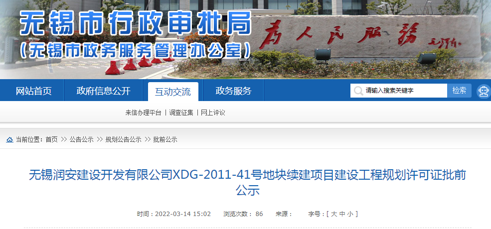 近日,无锡市行政审批局官网公示了无锡润安建设开发有限公司XDG-2011-41号地块续建项目建设工程规划许可证批前公示。
