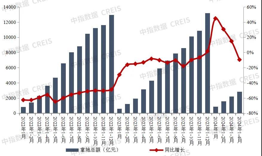 2022-2024年1-4月TOP100企业拿地总额 图片来源:中指院