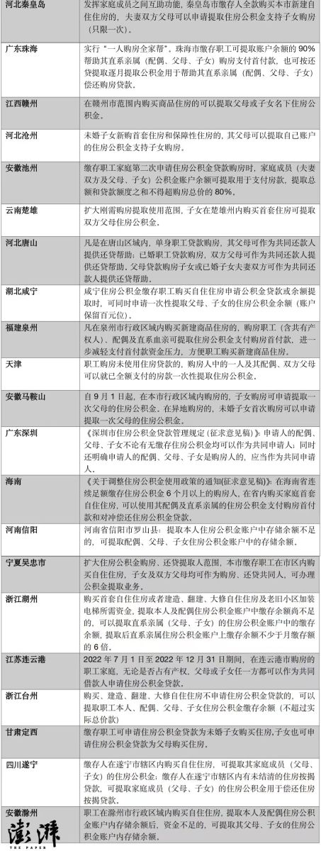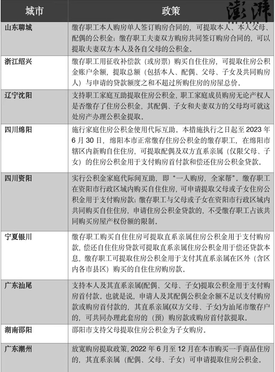 以四川绵阳为例,9月28日,四川绵阳市发布《绵阳市人民政府办公室关于印发进一步促进绵阳市房地产市场平稳健康发展若干措施的通知》,《通知》提出,施行家庭住房公积金使用代际互助,即“一人购房全家帮”。本措施执行之日起至2023年6月30日,绵阳市正常缴存住房公积金的缴存职工,在绵阳市辖区内新购自住住房,可提取配偶及双方直系亲属(仅限父母、子女)的住房公积金用于支付购房首付款和偿还住房公积金贷款。